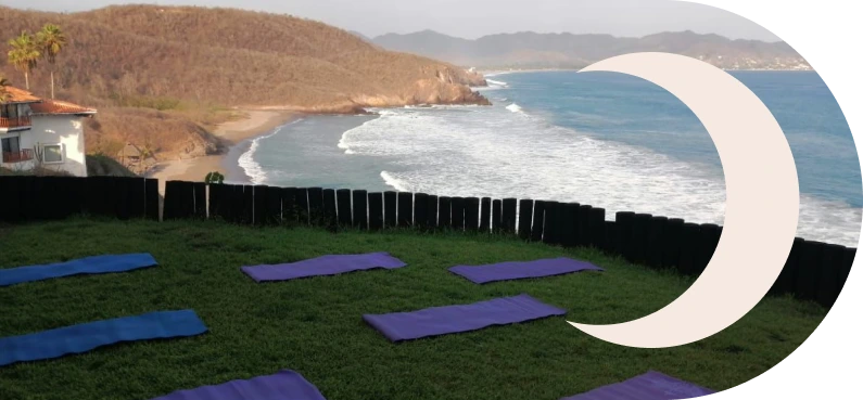 Plataformas de madera sobre la arena o entre la vegetación costera. Respirar, estirar, soltar. Estas sesiones solo se dan en eventos de naturismo. No disponible todos los días.